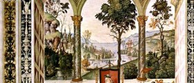 Dietro gli illustri personaggi si apre una grandiosa loggia decorata all'antica, che si affaccia su uno straordinario paesaggio. Come tipico del Pinturicchio, il paesaggio è ravvivato da alcuni elementi bizzarri, come lo sperone roccioso sulla sinistra e la città turrita lungo il fiume solcato da barche, simbolo caratteristico di ambienti nordici. Tipicamente umbri sono invece il lento digradare delle colline, che sfumano in toni azzurrini in lontananza per effetto della foschia, e i numerosi alberelli fronzuti, ravvivati da lriflessi dorati nel fogliame.