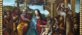 Il dipinto, iniziato dal Riccio e concluso da Arcangelo Salimbeni, si trovava sopra l’altare dedicato alla Natività di Gesù, mente oggi è appeso alla parete destra della chiesa. La scena rappresentata è quella dell’arrivo dei pastori a Betlemme dopo che l’Angelo ha annunciato loro la nascita del Salvatore Cristo Gesù. Nel dipinto il gesto della Madonna che alza il velo bianco pone in evidenza il corpo di Cristo. Nella parte alta dell'opera si scorge lo Spirito Santo che, sotto forma di colomba, scende sul Bambino, la cui nudità indica che Egli è vero uomo oltre che vero Dio. A fare da sfondo alla scena un edificio classico in rovina, simbolo del mondo antico romano che sta per finire, in contrasto con la vitalità del bambino Gesù che invece rappresenta il mondo cristiano che sta per nascere.