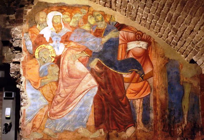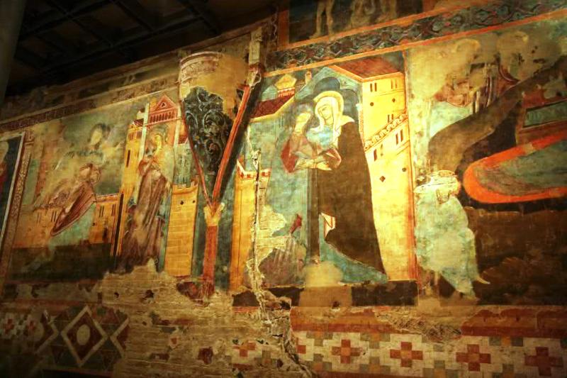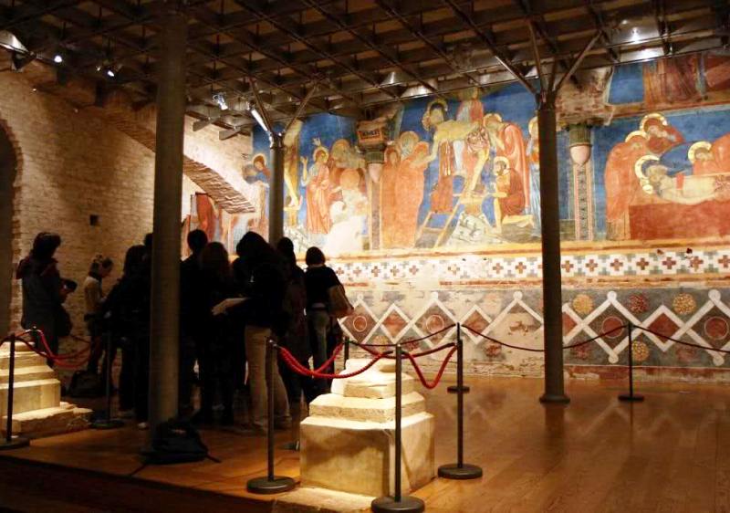 Bellissimi nella conservazione intatta dei colori e delle parti in oro anche gli affreschi con le “Storie della Passione”. Datati agli anni Settanta del Duecento, questi affreschi si rivelano sicuramente fondamentali per meglio comprendere lo sviluppo della scuola pittorica senese. Indubbiamente questo locale e i suoi dipinti, direttamente risorti dal XIII secolo, furono probabilmente la scuola e il laboratorio dove studiò e si formò Duccio di Buoninsegna e costituiscono, sicuramente, una delle maggiori attrazioni che Siena possa offrire al colto visitatore.