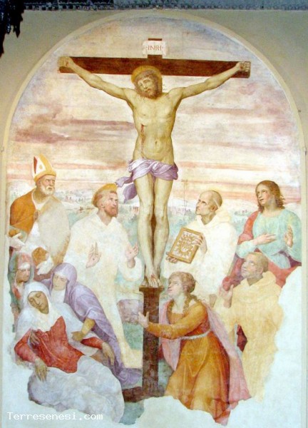 Nella terza cappella a sinistra della Basilica, si trova una Crocifissione su tavola, posta in origine in una cappella del chiostro cinquecentesco, dedicata alla Santa Croce.