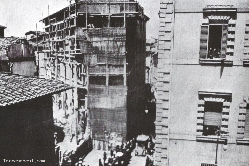 Sulla sinistra si nota il Palazzo Malavolti rivestito di impalcature e sulla destra le vecchie costruzioni in demolizione. Al loro posto nascerà la Casa del Popolo.
