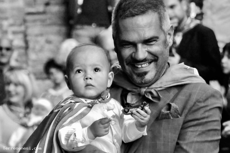Andrea Degortes, figlio di Alberto, partecipa al battesimo contradaiolo nel rione dell'OCA, in braccio allo zio Antonio.