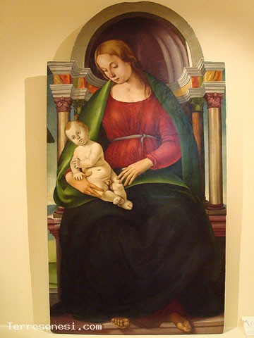 La Madonna in abiti semplici siede sotto una cupola, tenendo fra le braccia il Bambino.