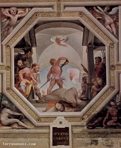 Una delle scene di giustizia romana affrescata sul soffitto della Sala del Concistoro del Palazzo Pubblico a Siena da Domenico Beccafumi tra il 1529-1535. Plinio il Vecchio, Libro 34, capitolo 15: "Trovo che il cast prima immagine in bronzo a Roma è stato quello di Cerere, era pagato dalla proprietà di Spurio Cassio, che fu giustiziato dal padre proprio quando ha cercato di farsi re ".