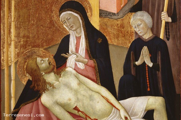 The table is characterized by the decidedly unusual subject and iconography that make the painting a sort of ex voto: the pale and lifeless body of Christ is lying on the knees of the Virgin who, with a painful gesture, mourns the passion and death of the Son to whose martyrdom the great cross alludes, the scourge hanging on the nail, the spear and the cane with the sponge with which the Roman soldiers gave vinegar to the dying Christ. Kneeling next to the Virgin, hands folded in prayer, is the commissioner of the work to which the two coats of arms painted at the base of the table refer, whose identification has allowed to recognize in the elderly gentleman the figure of Peter Volckammer, rich citizen of Nuremberg arrived in Siena following the emperor Sigismund and died here on 5 September 1432. Behind him is San Sinibaldo who, as patron saint of the Germanic city, holds a symbolic model of Nuremberg in his hand. Kneeling next to the Virgin, hands folded in prayer, is the commissioner of the work to which the two coats of arms painted at the base of the table refer, whose identification has allowed to recognize in the elderly gentleman the figure of Peter Volckammer, rich citizen of Nuremberg arrived in Siena following the emperor Sigismund and died here on 5 September 1432. Behind him is San Sinibaldo who, as patron saint of the Germanic city, holds a symbolic model of Nuremberg in his hand. The painting was probably executed shortly after the death of the rich personage, whose body was buried in the Sienese cathedral: the two crests of the Volckammer coat of arms are in fact devoid of the golden crown which the family had the right to bear their insignia from November of 1433.The panel was recognized by critics as one of the oldest works of the Sienese artist known as the 'Maestro dell'Osservanza'. The expression absorbed, vaguely dazed by the glances, the clear design of the profiles and the preference for a painting with enameled tones seem to prelude the solutions of Sano di Pietro whose activity, according to some scholars, the paintings belonging to the group 'Maestro dell'Osservanza 'would even constitute the oldest manifestation.