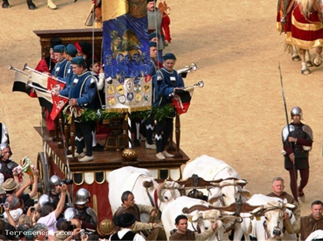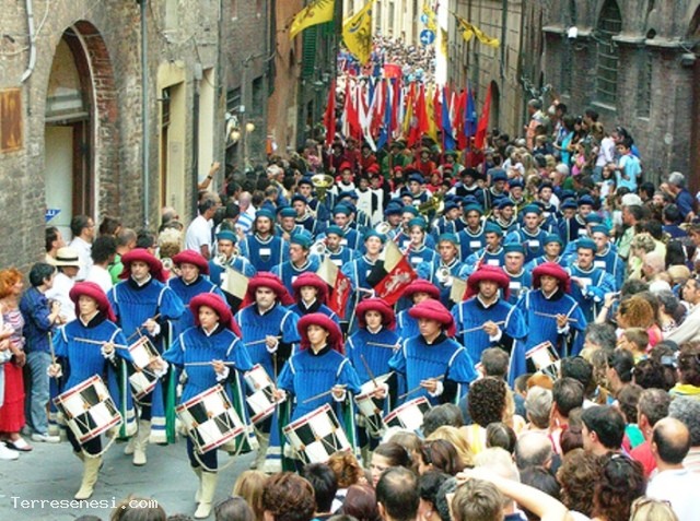 In ricordo della memorabile battaglia di Montaperti (1260) e dello scampato pericolo, i senesi decisero di indire il famoso Palio, ritenuto oggi da molti la manifestazione e festa storica più importante e rinomata d'Italia. La storia del Palio di Siena è però più articolata e complessa, e affonda le proprie radici in un'epoca ancor più remota. Nelle città italiane del XII e XIII secolo era usanza organizzare corse di cavalli, sia come spettacolo pubblico, sia come competizione tra i diversi allevamenti equini posseduti dai nobili cittadini e non. Parallelamente ai palii dei nobili, i cittadini di Siena cominciarono ad organizzare, più o meno spontaneamente, altre competizioni nei modi più disparati. L'organizzazione su base rionale della Festa e delle comunità trova la sua origine, nel tipo di organizzazione territoriale delle compagnie militari che caratterizzava l'esercito senese medievale. Quando non c'era la guerra, questa organizzazione si riversava nella competizione. La corsa del Palio prende il nome dal premio: il Palio, dal latino pallium (mantello di lana), era in genere un drappo di stoffa molto pregiata che veniva utilizzato per gli scopi più svariati. A Siena, in genere, era destinato alla chiesa del rione vincitore. Poteva essere utilizzato sia come arredo per la chiesa stessa. Questo avveniva perché, ai loro albori, le Contrade si appoggiavano per le loro riunioni alle Parrocchie o alle compagnie laicali che sostenevano e supportavano gli ordini monastici. È comprensibile come, in caso di vittoria, il premio venisse regalato alla Chiesa del rione, sia per riconoscenza sia per devozione. È dal Settecento che si afferma l’idea del Palio-dipinto e solo dopo la Seconda guerra mondiale che a dipingerlo vengono chiamati non più i bravissimi artigiani senesi ma pittori di fama nazionale e internazionale.