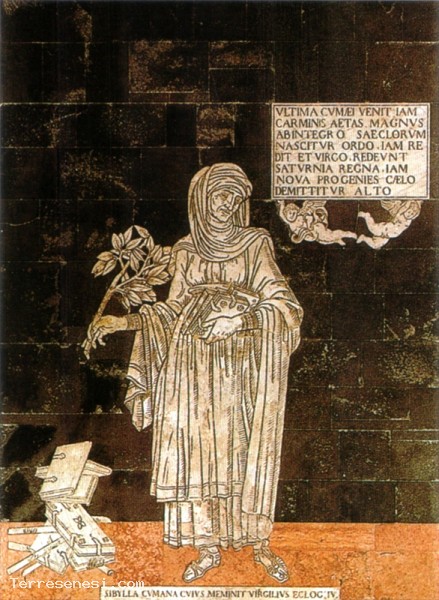 The third sibyl, famous for being visited by Aeneas, is the work documented by Giovanni di Stefano, as noted by a payment of 19 July 1482. Mentioned by Virgil in the fourth eclogue, he was famous in the Middle Ages as preannunciatrice the coming of Christ. The registration held by two angels in flight derives from Virgil: last cumaei venit iam carminis aetas magnus intact saeclorum nascitur ordo ab iam Redit et virgo, redeunt Saturnian reigns, iam nova progenies caelo demittitur up ("It's time have occurred the last period the poem Cumae, a large order of ages is reborn, now returns to the Virgin; return the kingdoms of Saturn. Now a new progeny is sent from heaven "). Looks like an old woman of a certain severity, with a veil that surrounds the head. With your right hand holding the mistletoe narrative Virgil, and with the left presses her three books. Six others, the Sibylline Books destroyed in the legend of Tarquin, burn stacked on the ground to his right.