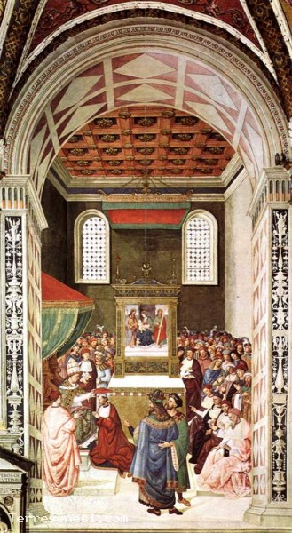 The appointment of Cardinal Piccolomini dates back to 1456 at the hands of Pope Calixtus III. This scene takes place in an environment enriched by a magnificent panoramic view as in other murals. ISulla left, the Pope supports the cardinal's hat on the head Enea Silvio knees.
