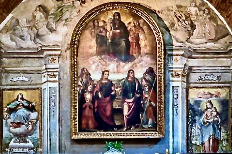Palace of the bottle of Sodoma, refining the Madonna col Bambino, angeli e santi è posta dietro l’altare sopra il coro lineo. The opera is inserted into the interior of a fine architecture, drawn a fresco, on the scene of the Marian scene: the Assunzione della Vergine and the Incoronazione di Maria.