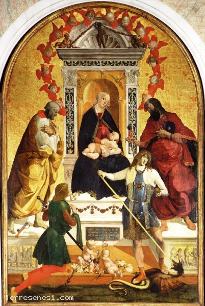The work of the Collegiate Church of St. Julian had to be just next to St. Francis receiving the stigmata, now in the Pinacoteca Comunale. It was praised by Vasari especially for the expression of St. Julian, who seems to set his eyes to the Madonna and Child in her arms "seems to afflict a lot of you have killed the father and mother."