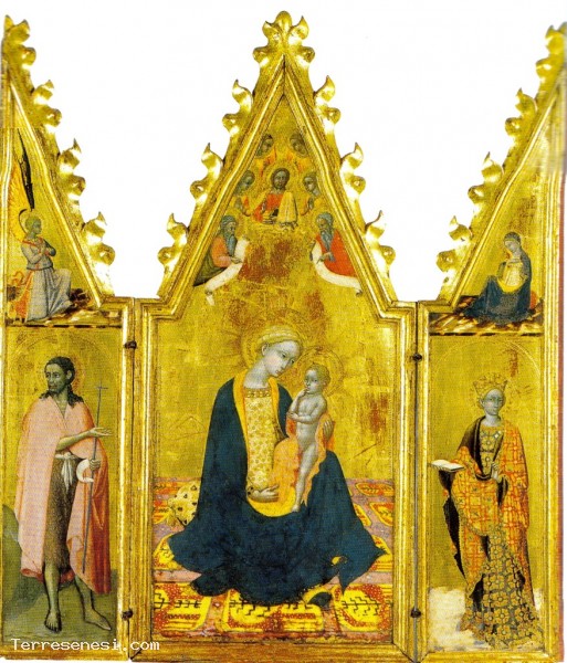 The small triptych, coming from the Chapter of the Pientina Cathedral, represents in its central compartment the Madonna of humility, in the ante Saint John the Baptist and Saint Catherine of Alexandria and in the cusps the Blessing Christ between angels and Prophets, the Announcing Angel and the Virgin Annunciata.