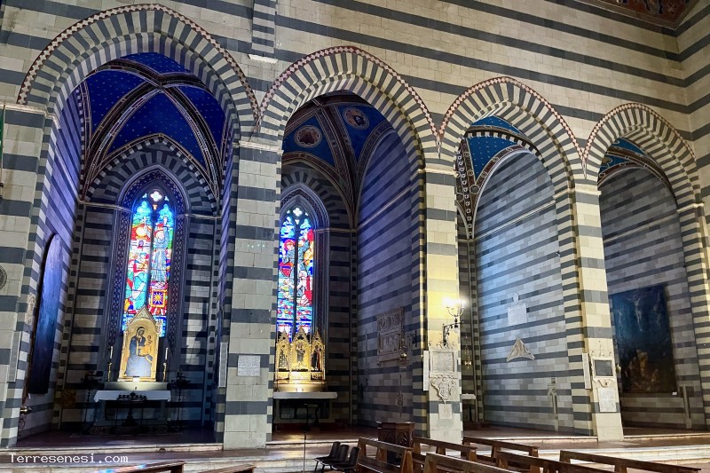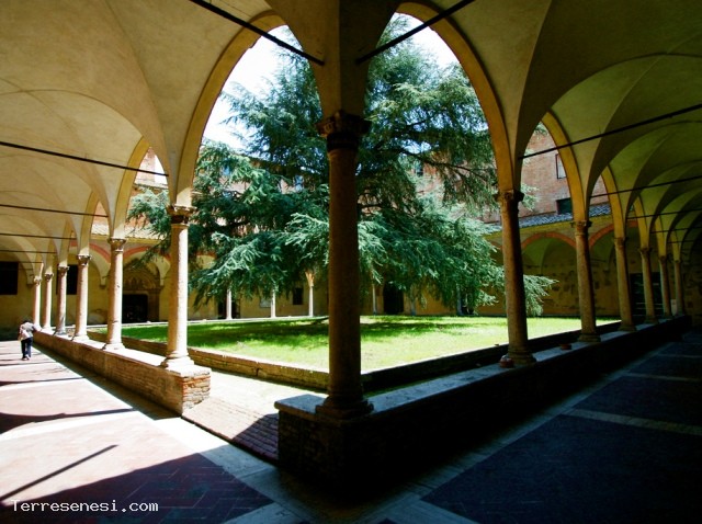 All'interno, in controfacciata si conservano i resti di due sepolcri trecenteschi e, in alto, due grandi affreschi frammentari staccati rispettivamente da Porta Romana e Porta Pispini e in prossimità della controfacciata è il quattrocentesco portale di Francesco di Giorgio Martini, originario della facciata. Nel lato sinistro della navata si incontra una Crocifissione di Girolamo di Benvenuto, seguita da sei pale ricollocate recentemente. All'inizio del lato destro della navata è presente la lunetta con una Visitazione degli inizi del Quattrocento, cui seguono tre tele, la Predica di San Giacomo di Giuseppe Nicola Nasini, la Natività della Vergine di Giovan Battista Ramacciotti e la Resurrezione di Lazzaro di Alessandro Casolani e Vincenzo Rustici. Oltrepassato il frammentario sepolcro trecentesco della famiglia Tolomei, giungiamo nel transetto destro dove si trova la cappella in cui sono venerate nel periodo invernale le "Sacre Particole", ostie rimaste miracolosamente incorrotte dal 14 agosto 1730, giorno in cui fu trafugata la pisside che le conteneva; le stesse furono rinvenute nella collegiata di Provenzano. La cappella è decorata sulla sinistra da un finto polittico con la Madonna col Bambino e Santi affrescato da Lippo di Vanni. Nella parete di fondo del transetto destro si trova il marmoreo San Francesco degli inizi del XIV secolo proveniente dalla facciata della chiesa. Oltrepassata la cappella centrale che ha l'altare maggiore di Leopoldo Maccari e Giuseppe Partini, si accede al transetto sinistro, ove proseguono le cappelle absidali. L'ambiente successivo ospita la Madonna col Bambino affrescata da Jacopo di Mino del Pellicciaio. Il transetto sinistro comprende inoltre altre due cappelle, in una delle quali si conservano le "Sacre Particole" nel periodo estivo. Le originarie forme architettoniche di tale luogo, dovute a Lorenzo di Mariano, sono state restaurate nell'Ottocento.