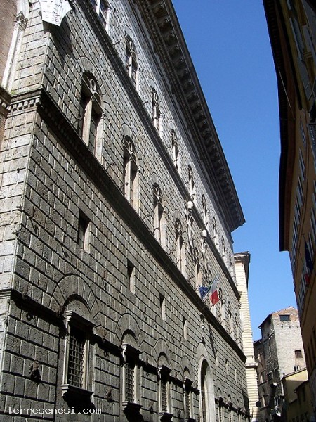 Il palazzo è uno dei pochi edifici in puro stile rinascimentale fiorentino. Venne costruito per volere di Giacomo e Andrea Piccolomini, nipoti di Papa Pio II, il palazzo fu probabilmente progettato da Bernardo Rossellino, importante architetto dell'epoca, mentre i lavori furono diretti da Pier Paolo del Porrina. L'armoniosa facciata in pietra presenta due stemmi dei Piccolomini ed è coronata da un elegante cornicione, decorato con le armi dei Piccolomini. Nel cortile interno spiccano i bellissimi peducci. Il palazzo dal 1858 ospita l'Archivio di Stato, uno dei più ricchi d'Italia, con circa 60.000 pergamene di enorme valore, antichi atti e codici dell'ottavo secolo, antichi documenti di Stato del periodo dal 1100 al 1800. Inoltre, a Palazzo Piccolomini ha sede il Museo delle Tavolette di Biccherna, che espone una raccolta delle tavolette di Biccherna e Gabella, antiche amministrazioni finanziarie di Siena. Di legno dipinto, le tavolette venivano usate come copertura dei registri contabili.