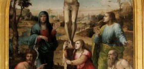 Nella grande tavola principale il posto d'onore, al centro, è dato dalla Crocefissione, di...
