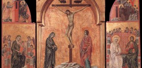 Piccolo altare portatile decorato con tre dipinti autografi di Duccio di Buoninsegna, real...