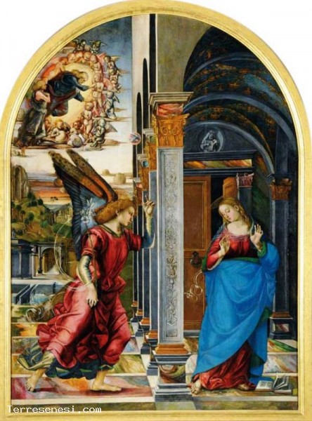 Commissionata al pittore nel 1490 per la cappella della compagnia della Vergine nella cattedrale di Volterra, venne terminata nel 1491, come certificano la data e la firma sul pilastro in primo piano. Si tratta di una delle opere più alte del periodo centrale di Signorelli ancora caratterizzato da asprezze disegnative e coloristiche ma forse per questo quasi una monade dall'algida bellezza. La vergine viene sorpresa dall'angelo in un portico e per la sorpresa lascia cadere a terra il libro che stava leggendo. Lo spazio invece di dilatarsi grazie alla prospettiva si comprime e verticalizza, in special modo nella corsa rapida dei pilastri e nel paesaggio sullo sfondo. La cromia dei marmi e delle vesti è tutta giocata su rossi, verdi e blu, fino ad arrivare alla nota raffinata e poetica delle piume di pavone dell'angelo. I panneggi quasi cesellati nel metallo creano tour de force sui corpi dei due protagonisti e l'occhio del riguardante si perde nella miriade di anfratti ombrosi creati dalle pieghe. Signorelli ripropone l'ambientazione tipica per l'Annunciazione dove inserisce i numerosi simboli mariani, dal pilastro alla porta aperta, dal ponte alla fortezza. Un bassorilievo con David che suona, incastonato sotto le volte del portico suggella la lettura mariana della scena.