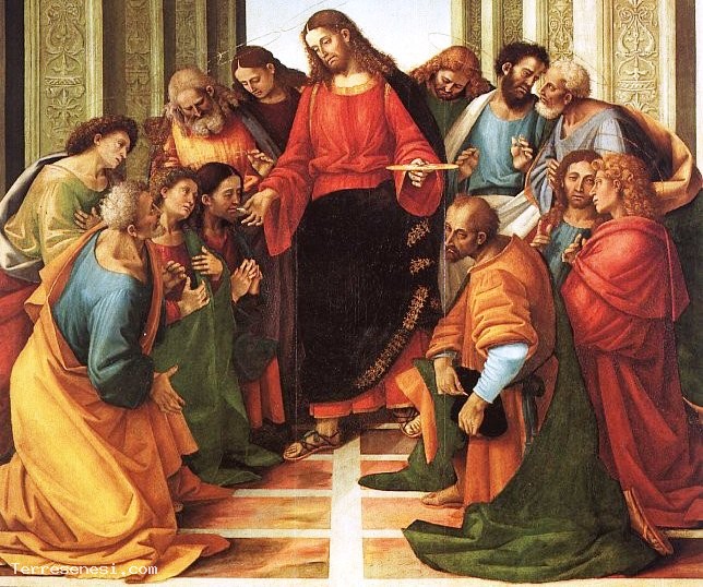 Particolare è la disposizione dei dodici Apostoli, non seduti intorno ad una tavola apparecchiata ma riuniti intorno alla figura di Cristo, pronti per ricevere l'ostia. Da notare l'atteggiamento di Giuda, che sottolinea la consapevolezza del tradimento nascondendo l'ostia dentro la sua borsa e guardando verso l'esterno della composizione.