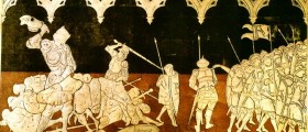 Sulla destra, la Storia di Sansone è fiancheggiata dalle figure di Mosè e di Giuda Maccabeo. La scena, attribuibile al Sassetta come l'altra scena simmetrica vicino al transetto sinistro, perchè analoga per tecnica e stile, è dominata dalla figura gigantesca di Sansone, che sta massacrando con una mascella d'asino in pugno i guerrieri filistei. uno lo regge col braccio, alcuni sono già esanimi a terra e altri fuggono impauriti. Anche qui ricorre in alto il motivo degli archetti trilobati a tutto sesto.