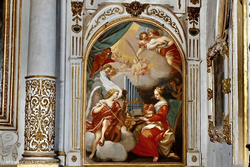 Le due opere ai lati dell’altare, la tela con Santa Cecilia che suona l’organo risalente al primo quarto del Seicento ed attribuita a Antonio Buonfigli e l’affresco con Il Concerto d’Angeli firmato da Ventura Salimbeni e datato 1612, richiamano la passione per la musica delle giovani agostiniane del Santuccio che suonavano e amavano dedicarsi al canto.