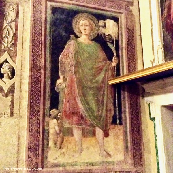 Sopra di esso si apre un oculo quattrocentesco con una vetrata della seconda metà del XVII secolo, con la raffigurazione del santo titolare.