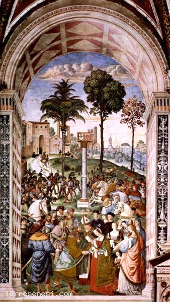 Enea Silvio era già vescovo di Siena quando presentò a Federico III la sua futura sposa Eleonora d'Aragona. Il vescovo si preoccupò delle trattive del matrimonio e accolse i due nella sua città il 24 febbraio 1452. Lo sfondo ritrae con abbondanza di particolari il luogo dell'avvenimento, fra porta Camollia e l'antiporto. Al centro della scena la colonna con gli stemmi dei due sposi che venne fatta erigere in quell'occasione e tutt'ora esistente in loco.