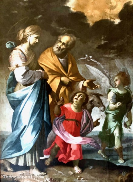 Il san Giuseppe esorta, con la sinistra, la Madonna a proseguire il viaggio, mentre in basso a destra un angelo conduce l'asinello tenendolo per una corda.