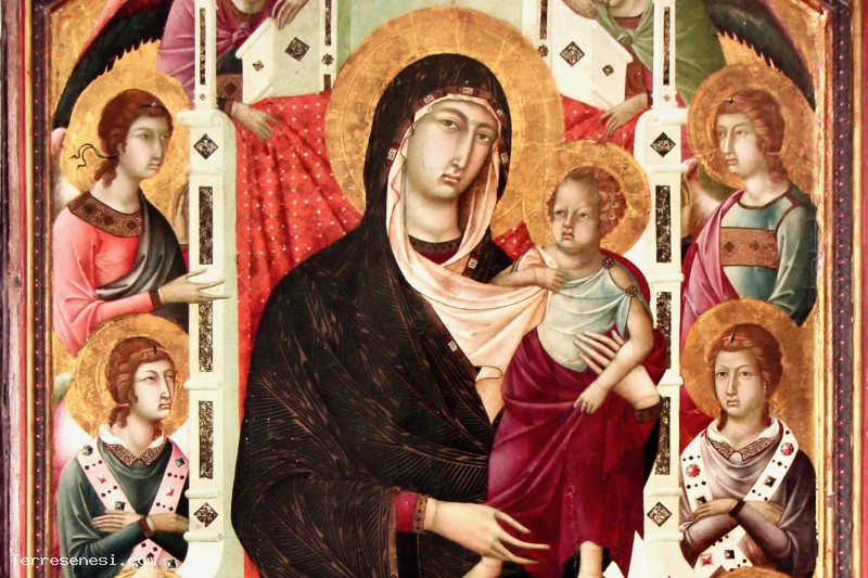 La Maestà dipinta, forse all'inizio del XIV secolo, da Segna di Bonaventura come attesta l'iscrizione alla base del dipinto che ricorda anche i nomi dei committenti raffigurati in basso, e forse derivante da quella dipinta da Duccio nel Palazzo Pubblico di Siena nel 1302.