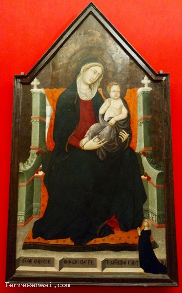La Madonna in trono col Bambino di Niccolò e Francesco di Segna è una tavola trecentesca dalla forma cuspidata proveniente dalla Chiesa di san Francesco. Lo sfondo, che dobbiamo immaginare dorato, presenta delle punzonature lungo la cornice e intorno ai volti dei personaggi, a disegnare le aureole. In basso sulla destra, si trova la figura di una donna in preghiera raffigurata in dimensioni ridotte rispetto alla Madonna e al Bambino: si tratta della committente dell'opera. La scritta che corre alla base del trono ci svela l'identità della donna “Monna Muccia moglie che fu di Guerrino Ciantari”, una ricca e devota vedova, che donò questa tavola alla Chiesa di San Francesco.
